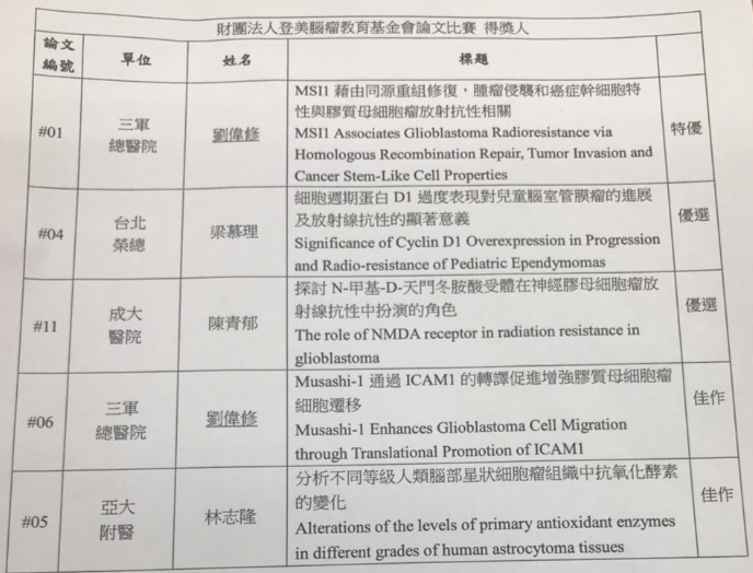 2018神外年會已於2018.11.04閉幕 我們恭喜以下論文競賽的得獎人員 特優 - 三軍總醫院 劉偉修 醫師團隊 優選 - 台北榮總 梁慕理 醫師團隊 優選 - 成大醫院 陳青郁 醫師團隊 佳作 - 三軍總醫院 劉偉修 醫師團隊 佳作 - 亞大附醫 林志隆 醫師團隊 特別感謝 神經外科醫學年會單位 協助 所有工作人員都辛苦囉!